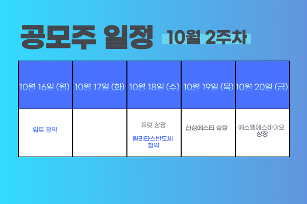 | [공모주] 10월 2주차 공모주 청약 일정 (62) | 2023.10.09 |