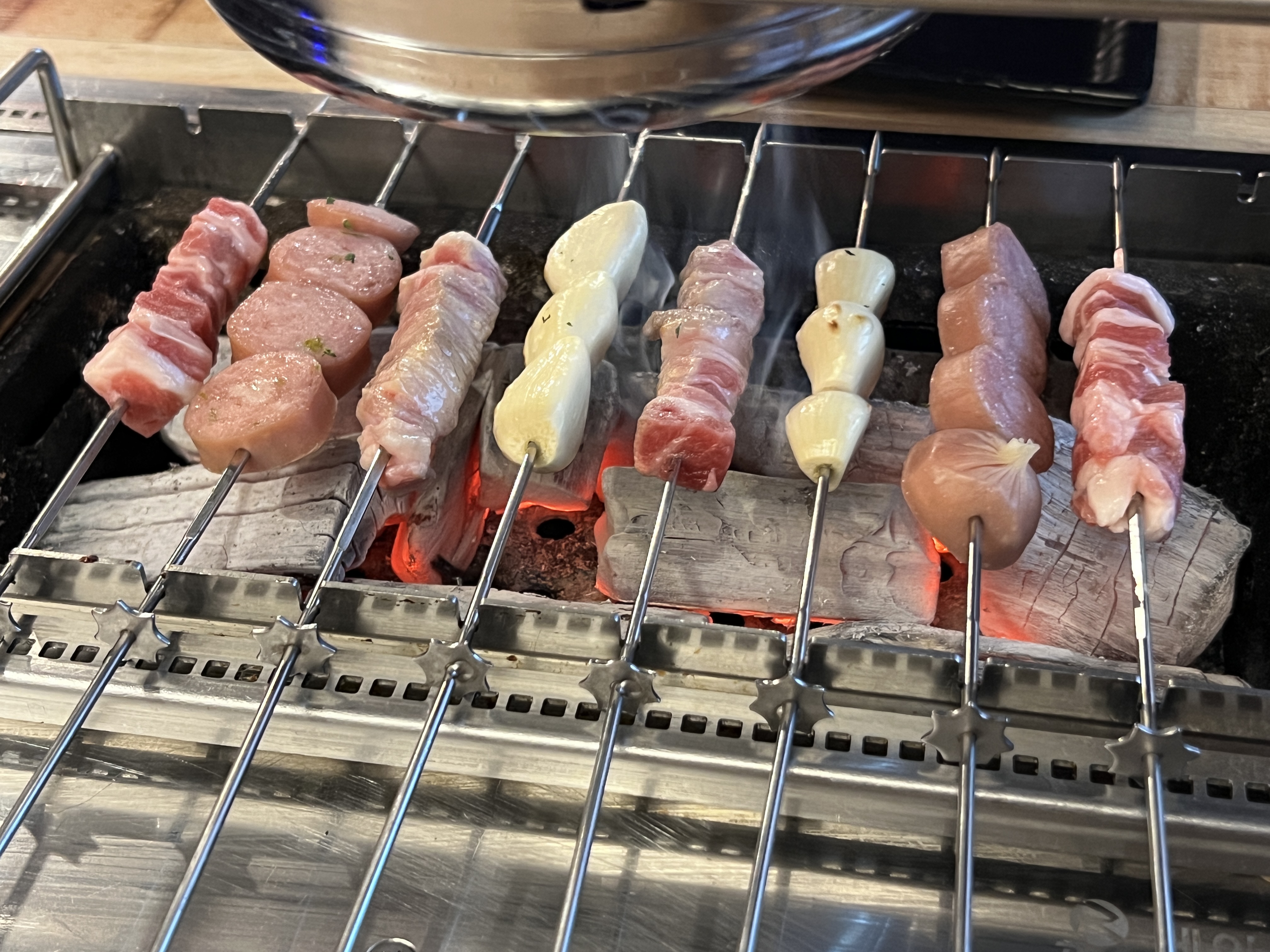 꼬치 2인뢄 + κ³„λž€νƒ• + κΏ”λ°”λ‘œμš° or κ°€μ§€λ§Œλ‘νŠ€κΉ€μ΄ λ‚˜μ˜€λŠ”λ°, μ €λŠ” κΏ”λ°”λ‘œμš° μ‹œμΌ°μ–΄μš”~