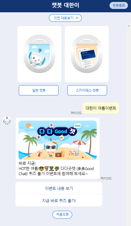 ์ด์ ๋ํํญ๊ณต ์ฑ๋ด ๋ํ์ด ์ด๋ฒคํธ ์์์ด์์ต๋๋ค. ํ์ด์ ๋น์ด์ :)