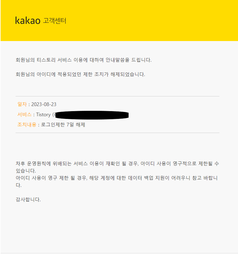 8์ 23์ผ๋ถํฐ 8์ 30์ผ๊น์ง ๋ก๊ทธ์ธ์ ํ์ด๋ผ๊ณ ๋ฉ์ผ๊ณผ ์๋ฆผ์ ๋ฐ์์ต๋๋ค.