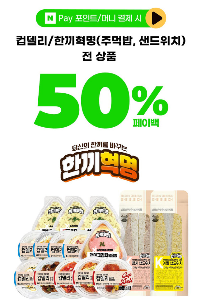 ์ปต๋ธ๋ฆฌ/ํ๋ผํ๋ช (์ฃผ๋จน๋ฐฅ, ์๋์์น) ์ ์ํ 50% ํ์ด๋ฐฑ