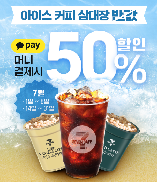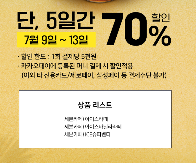 ์นด์นด์คPAY ๋จธ๋๊ฒฐ์ ์, 50 % ํ ์ธ(7์ 1~8์ผ / 14~31์ผ) / 5์ผ๊ฐ 70%ํ ์ธ