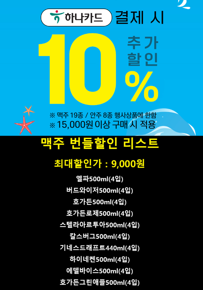 ๋ชฉ๊ธํ ์ผ ํ๋์นด๋ ๊ฒฐ์ ์, ๋งฅ์ฃผ ๋ฒ๋คํ ์ธ / ์์ฃผ 2+1 ์ถ๊ฐ 10% ํ ์ธ |