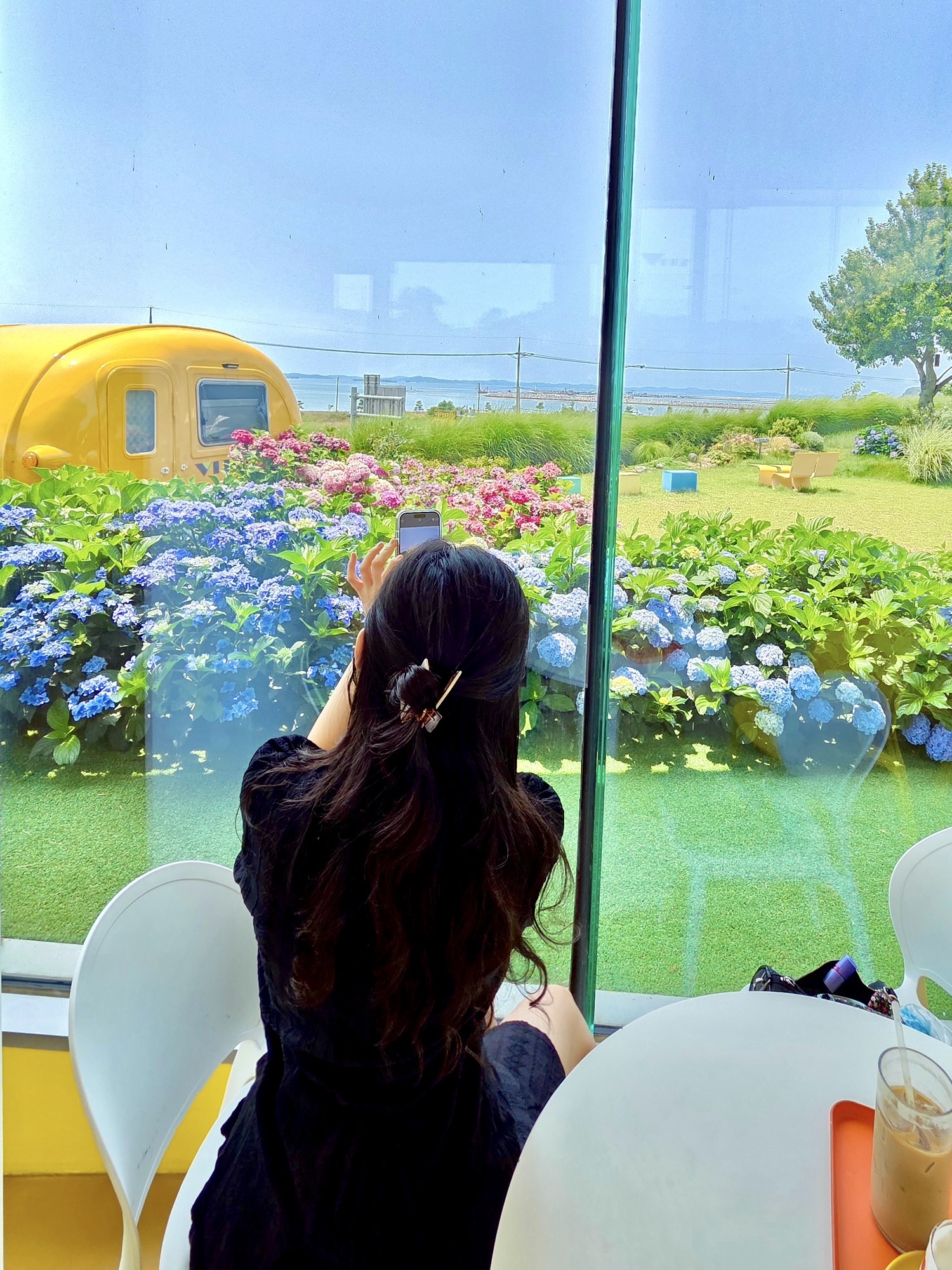 ์ฐฝ๋ฐ์ผ๋ก ํผ์ณ์ง ํธ๋ฅธ ๋ฐ๋ค๋ฅผ ๋ฐ๋ผ๋ณด๋ฉฐ ๋ง์๋ ์์ํ ์ปคํผ ํ ์์ ๊ทธ์ผ๋ง๋ก ์ฒ๊ตญ์ด์์ด์.
